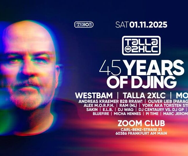 45 Jahre Talla 2XLC eine lebende Legende feiert! Unglaublich, aber wahr: Talla 2XLC steht seit 45 Jahren an den Decks – im Namen der elektronischen Musik und mit ungebrochener Leidenschaft. Am 1. November feiern wir dieses besondere Jubiläum mit einer großen Nacht im ZOOM Frankfurt......